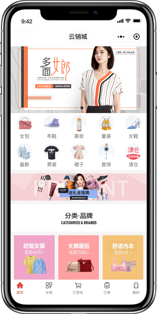 PC端、移动端H5、ANDROID APP、IOS APP、小程序,SaaS模式按年租用,多年行业经验,支持所有主流终端,为品牌商搭建个性化购物商城,可独立部署